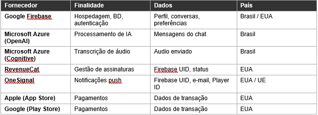 Alguns dados podem ser transferidos e processados nos Estados Unidos (RevenueCat, OneSignal, Apple, Google) e na União Europeia (OneSignal). Os serviços de IA (Azure OpenAI e Cognitive Services) e o Firebase utilizam servidores no Brasil quando disponível.