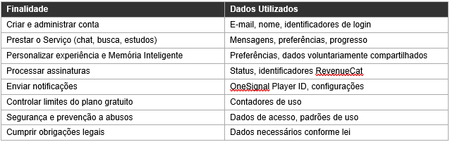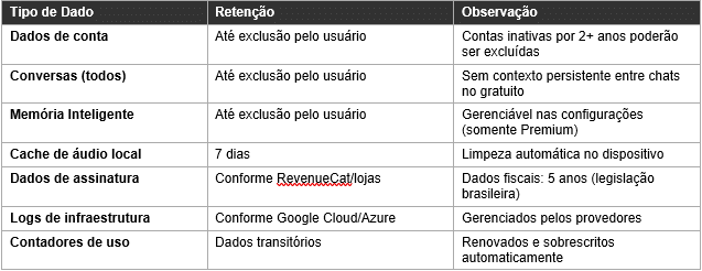 Memória Inteligente (Premium): No plano gratuito, cada conversa é independente e a IA não retém contexto entre conversas. No plano Premium, a funcionalidade de Memória Inteligente permite à IA armazenar informações relevantes fornecidas voluntariamente por você (como nome, data de aniversário, preferências de estudo) e utilizá-las para personalizar sua experiência em diferentes conversas e funcionalidades do App. Esses dados são armazenados de forma estruturada, vinculados ao seu perfil, e podem ser visualizados, editados ou excluídos a qualquer momento.