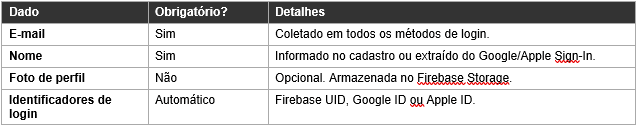 • De terceiros: dados de autenticação do Google e Apple; dados de assinatura via RevenueCat; dados de notificação do OneSignal.